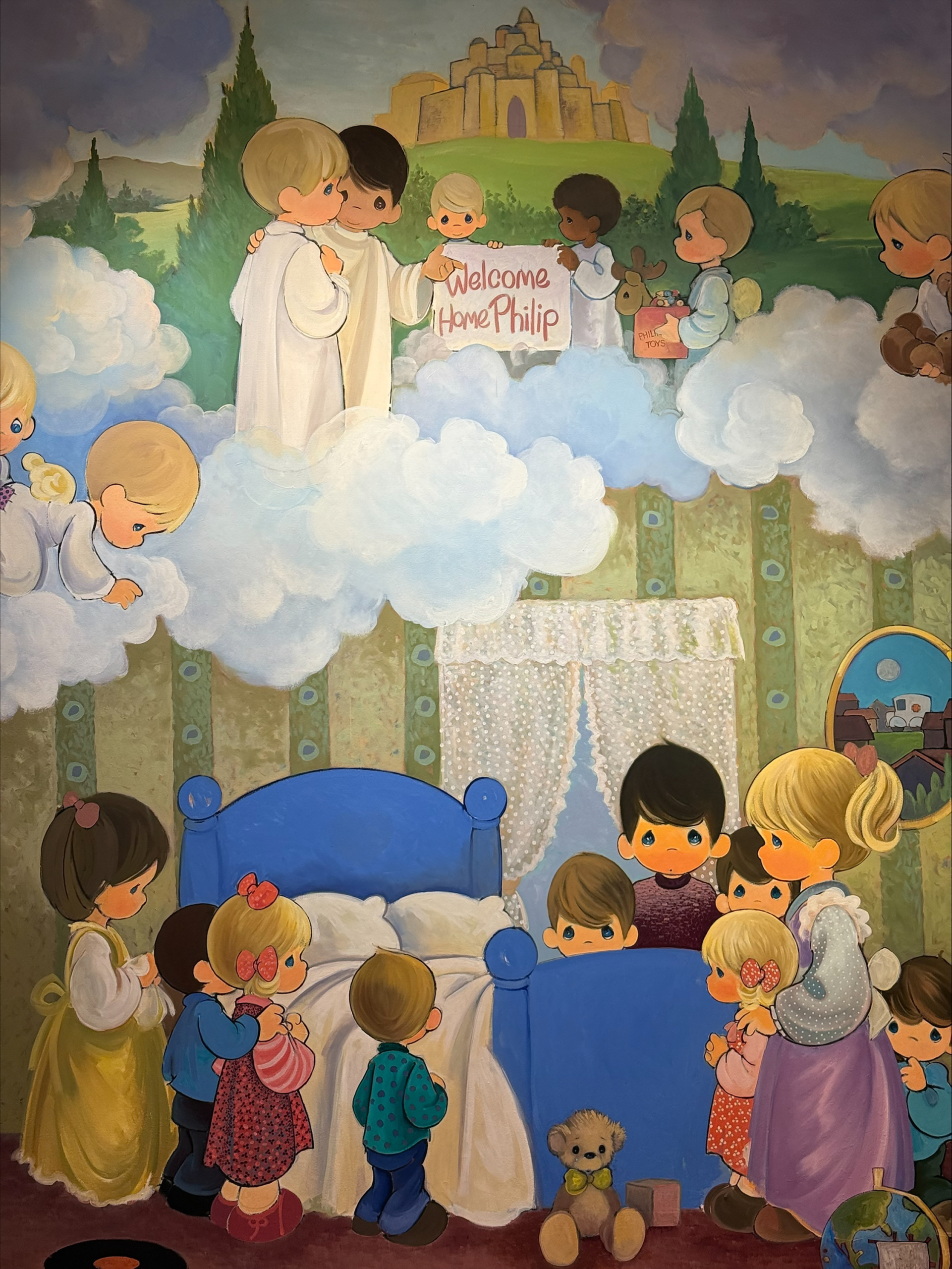 As we waited for the groundskeeper to unlock the Chapel, I explained to Terri about my friend Brett. Terri in turn told me about her husband’s agonizing cancer treatment, which has been an ongoing trial. But if I came here in grief, she added, I had come to the right place. Samuel Butcher, the founder of Precious Moments, who built the Chapel in gratitude to God for his financial success, had lost an adult son in a car accident. In fact, the Chapel is a shrine of sorts to many who have lost loved ones. First Terri took me to the Chapel that honors Sam’s son. On the wall there was a mural of children surrounding an empty bed, with a “Welcome Home Philip” sign above. It reminded me of El Greco’s 1586 painting The Burial of the Count of Orgaz, which also shows heaven opening to welcome the departed. She showed me the “Book of Remembrance” signed by many who have made pilgrimages to this Chapel to grieve lost children. I found myself telling Terri about my son Clement, who my wife and I lost in a late miscarriage years ago. Although I could tell from the guest book that this was not the first time Terri had heard such a story, she listened to me as if it was.