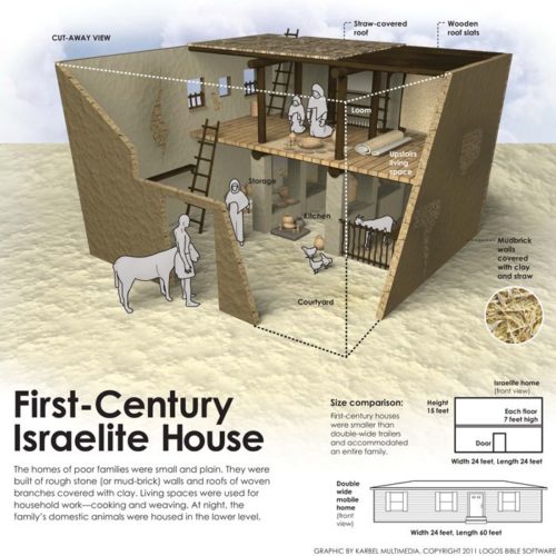 But why is there a manger in the house? Because every house had one on the ground floor for their animals. The whole born-in-a-cave business is from the Protevangelium of James. The idea of Jesus being clothed in tattered rags comes from the King James Version, though the word simply means “swaddled” (see Ezekiel 16:4, LXX). The presence of sheep in the nearby field (Lk 2:8) tell us that it isn’t winter, but closer to summer. And while we don’t know much (or anything) about Joseph’s backstory, it’s unreasonable to expect a son of David to be turned away by even his distant family.