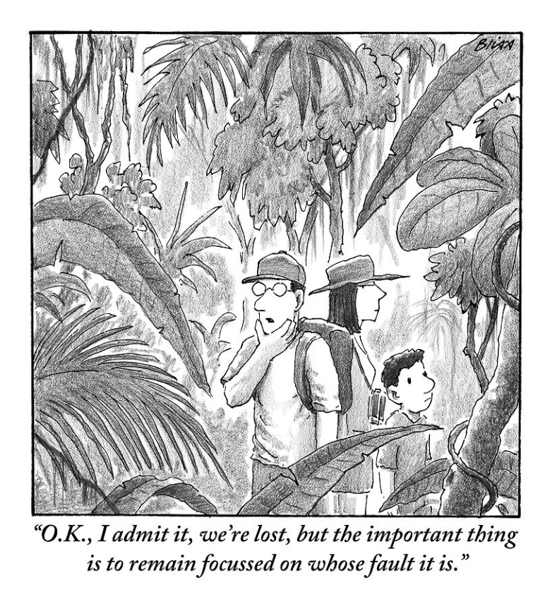 To be clear, you will find echoes of the aphorism above in many a therapist’s office. A good couple’s counselor will enable their clients to see how counterproductive blame is in their relationship. How destructive. It goes nowhere, just festers and squashes affection. A relationship that works is one that can successfully move beyond blame as its primary rubric of relating.