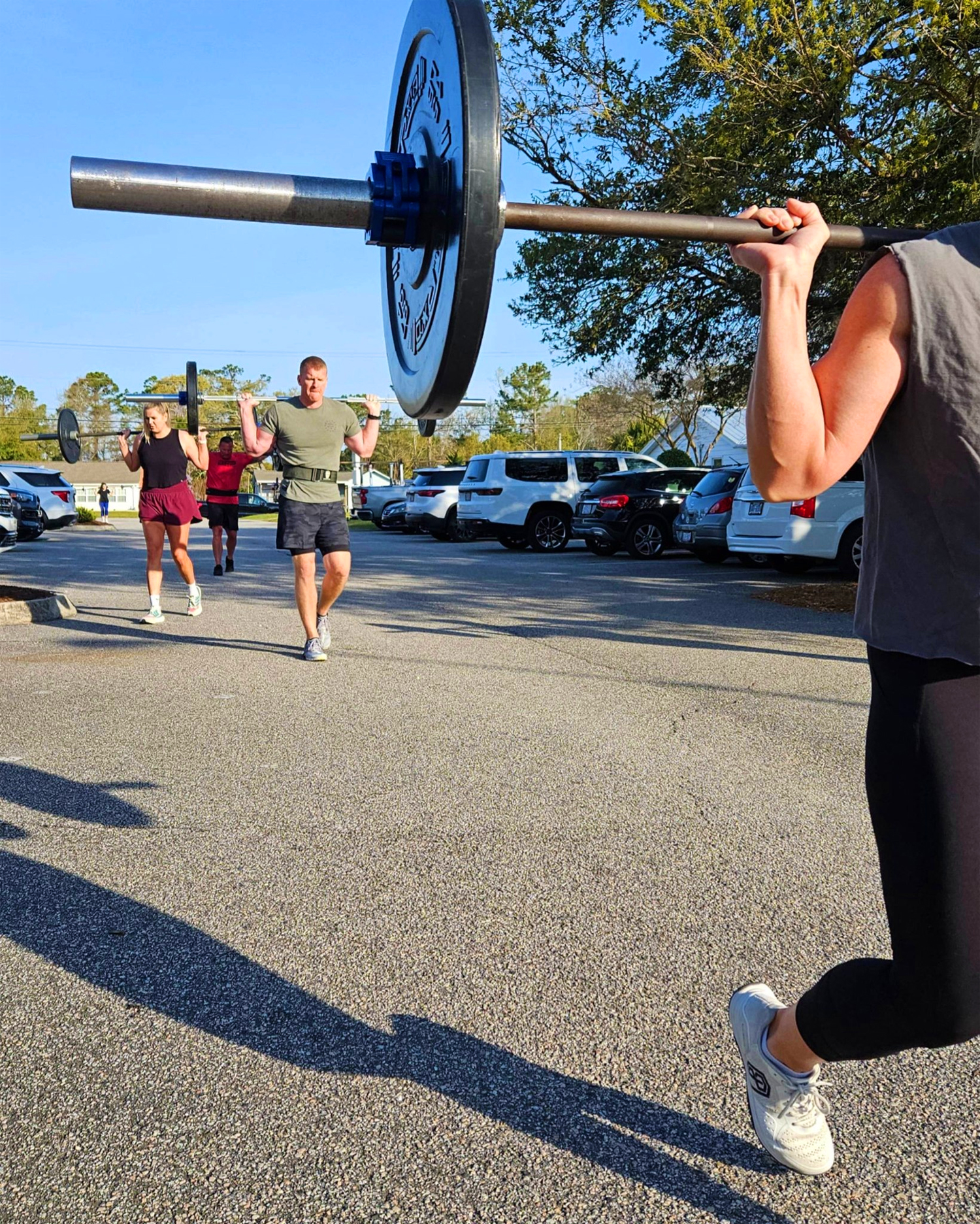 We swung our barbells overhead to rest them on our backs and began our walk to the third stop sign on Hollywood Street. Coach Gavin ran ahead to capture us on iPhone video at the 50-meter mark. We started out fresh, a bit silly, some smiling, perhaps betraying a bit of emotional, spiritual, and certainly physical discomfort.