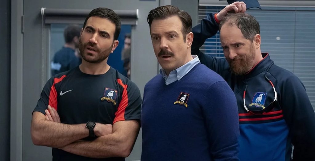 Beard and Roy decide to show the despondent Richmond team a purloined video that outs West Ham’s coach, a former Richmond coach Nathan Shelley, up to some vey bad-acting in the deserted Richmond locker room. Nathan, on the sly, sneaks in and tears the iconic “Believe” sign in two. The coaches, Ted included, had already seen the damning video. Ted had no interest in using it as a motivational device for his Richmond squad, but Beard and Roy have another idea.