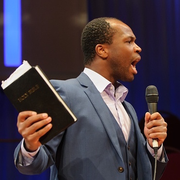 Associate pictured on the left. Pastor Paul on the right, with the mic.