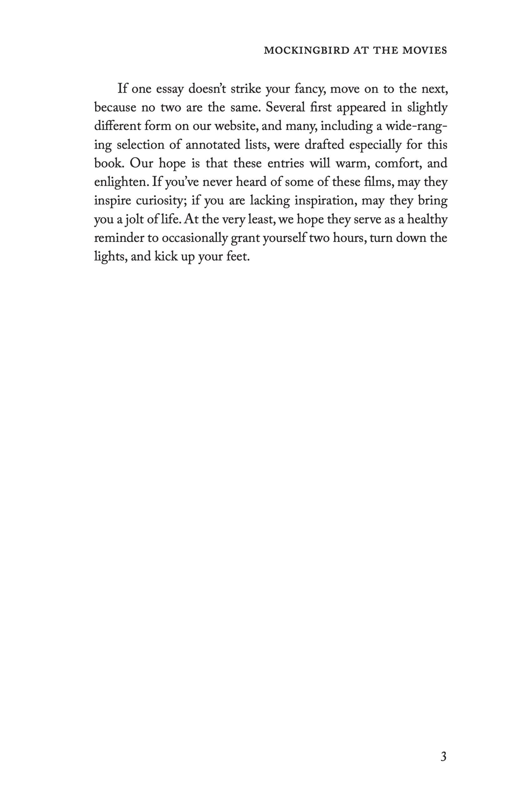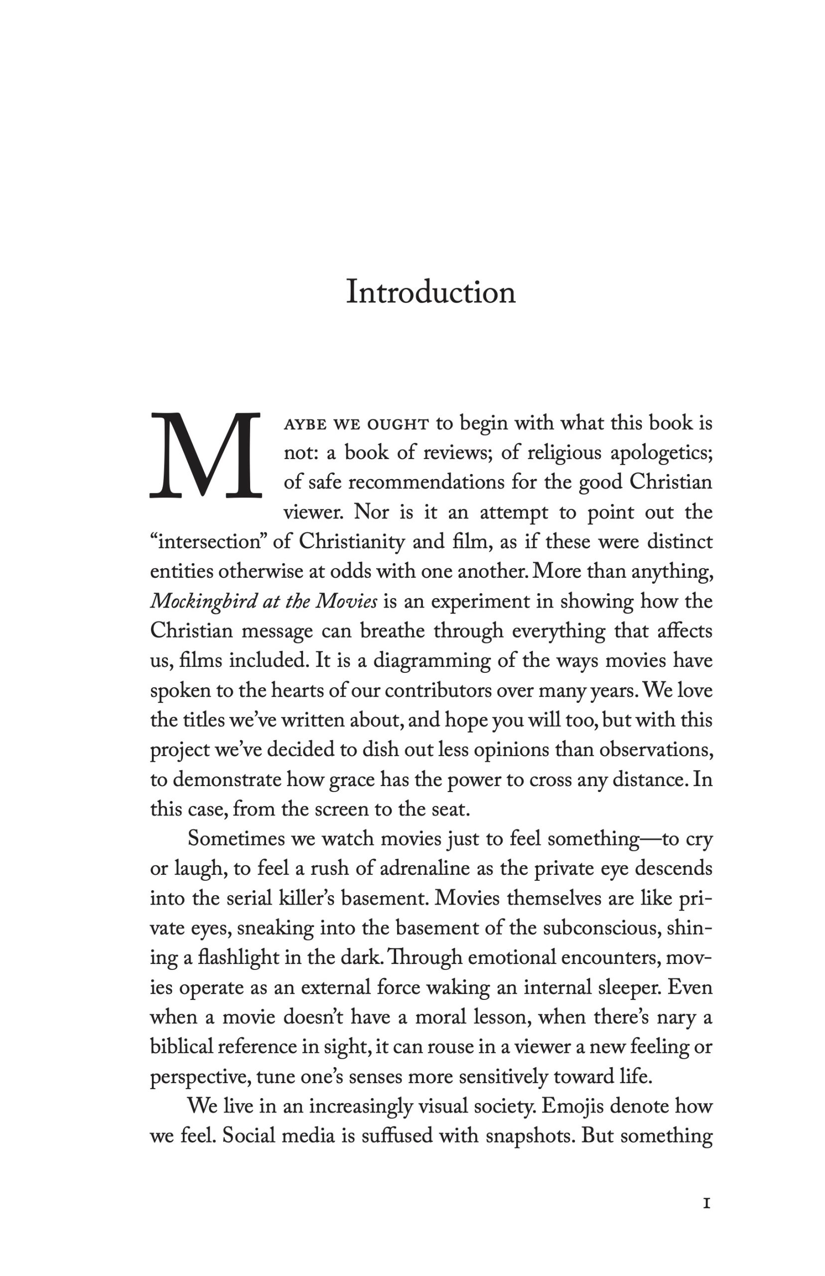 A movie theater is a magical place. We laugh and cry, marvel and curse — occasionally we are even transported, the projector casting fresh light on both ourselves and the world around us. Mockingbird at the Movies is a collection of essays from a wide range of contributors, exploring the films that have touched us most. Some are beautiful, some confrontational, some silly, some sad, some all of the above; taken together, they bear witness to the power of film to move the heart and lift the spirit. Grab your popcorn and press play.