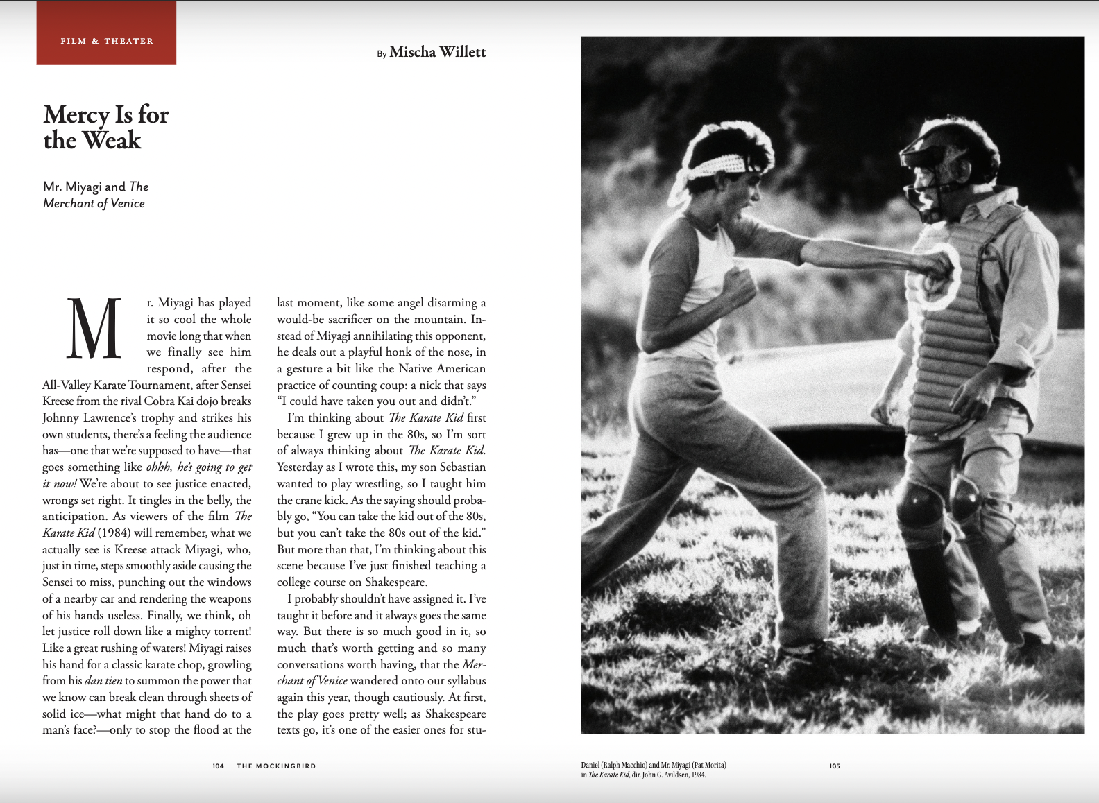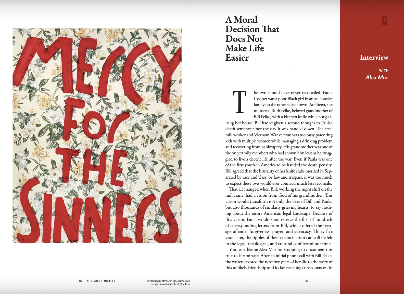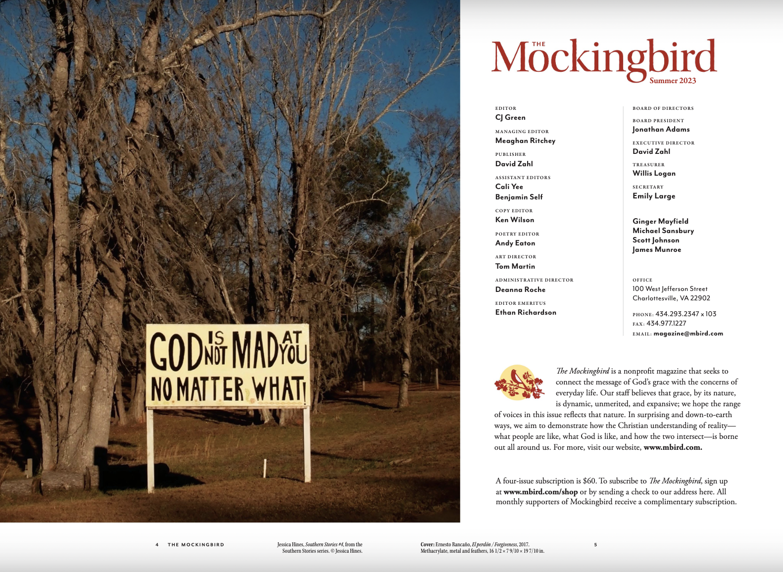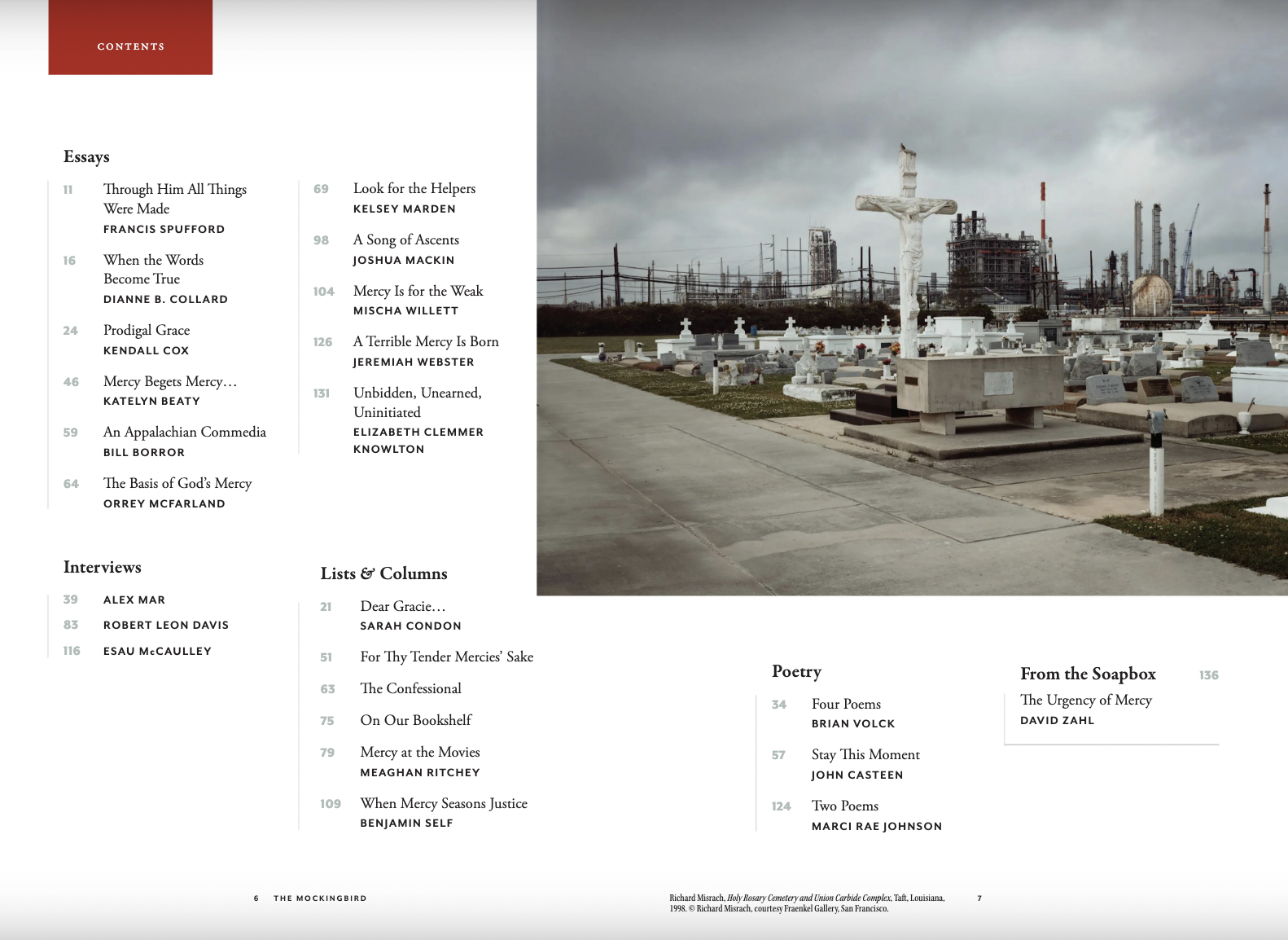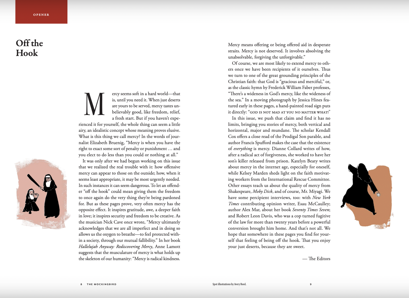 In this issue, we push that claim and find it has no limits, bringing you stories of mercy, both vertical and horizontal, major and mundane. The scholar Kendall Cox offers a close read of the Prodigal Son parable, and author Francis Spufford makes the case that the existence of everything is mercy. Dianne Collard writes of how, after a radical act of forgiveness, she worked to have her son’s killer released from prison. Katelyn Beaty writes about mercy in the internet age, especially for oneself, while Kelsey Marden sheds light on the faith motivating workers from the International Rescue Committee. Other essays teach us about the quality of mercy from Shakespeare, Moby Dick, and of course, Mr. Miyagi. We have some percipient interviews, too: with New York Times columnist Esau McCaulley; author Alex Mar, about her book Seventy Times Seven; and Robert Leon Davis, who was a cop turned fugitive of the law for more than twenty years before a powerful conversion brought him home. We hope that somewhere in these pages you feel that feeling of being off the hook. That you enjoy your just deserts, because they are sweet.