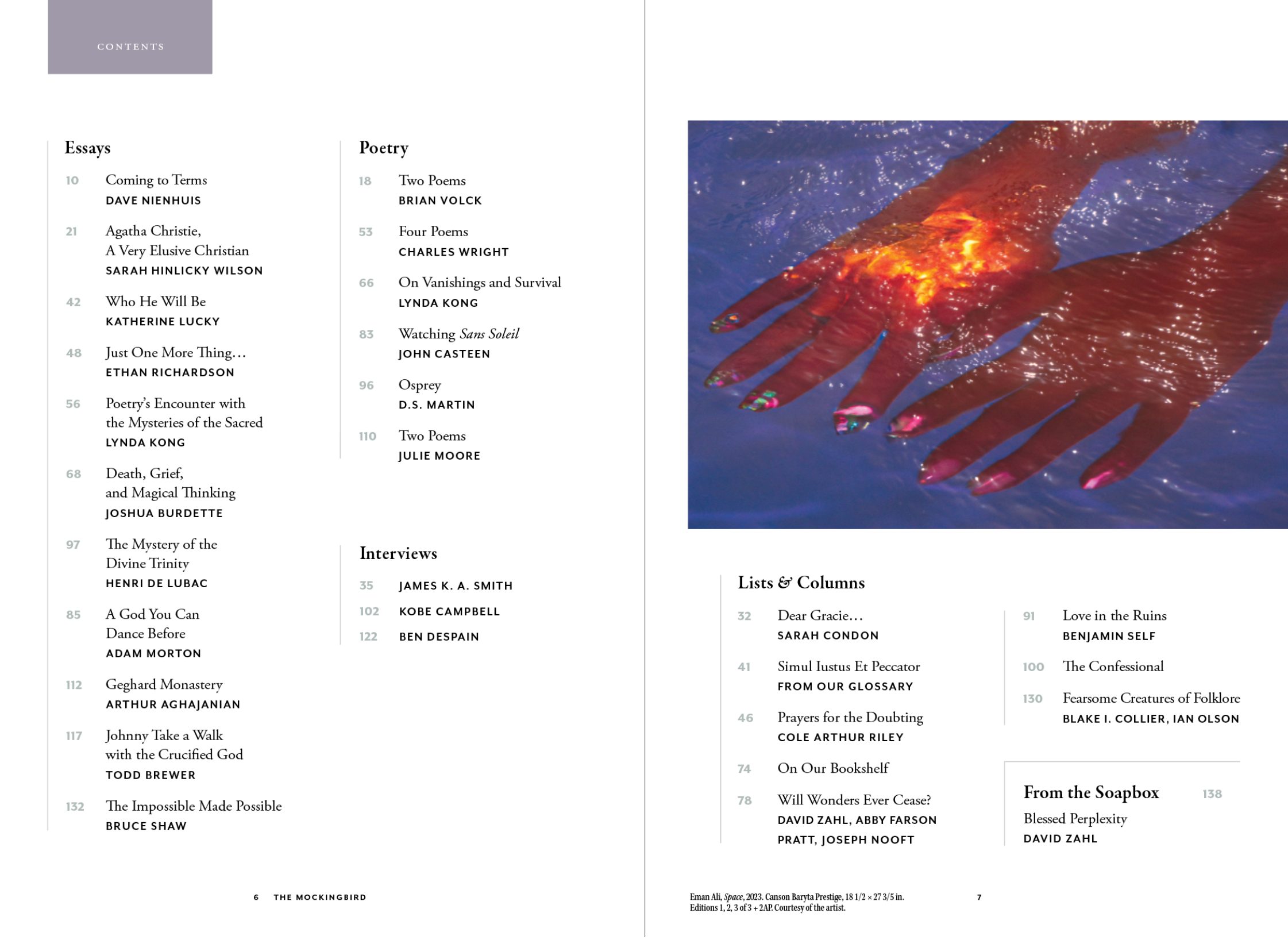 In these pages, we collaborate with contributors from a variety of backgrounds to catch a glimpse of the cosmic goings-on. We talk about the everyday mysteries of grief, illness, pregnancy, and magic shows. With Sarah Hinlicky Wilson, we dive into the peculiar religious life of the Queen of Crime, Agatha Christie. Former Mockingbird editor Ethan Richardson makes a triumphant return with an essay about that classic glass-eyed Lieutenant Columbo. We also have the privilege of publishing a stunning folio of four poems by the Pulitzer Prize-winning former Poet Laureate of the United States, Charles Wright — all gifted to us from his own typewriter. In interviews, the philosopher James K.A. Smith lays out a warm, capacious definition of mystery, while author and therapist Kobe Campbell discusses the mysterious process of emotional and mental healing. And that’s just the beginning. With essays by Kate Lucky, Todd Brewer, Adam Morton, Lynda Kong, Dave Nienhuis, Bruce Shaw, Joshua Burdette, Arthur Aghajanian, and poetry by Cole Arthur Riley, John Casteen, Julie Moore, Brian Volck, and DS Martin, this is one of our most packed issues yet.