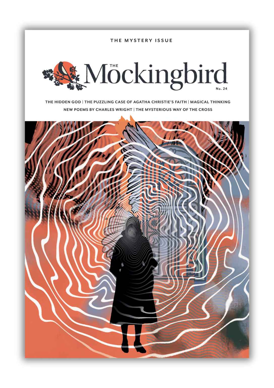 In these pages, we go right up to that curtain. We try, with God’s help, to pull it back. Collaborating with contributors from a variety of backgrounds and fields of expertise, we aspire to offer a glimpse of the cosmic goings-on. With the theologian Ben Despain, we discuss whether such a metaphorical curtain exists at all — spoiler: Despain thinks not. We talk about the everyday mysteries of grief, illness, pregnancy, and magic shows. With Sarah Hinlicky Wilson, we dive into the peculiar religious life of the Queen of Crime, Agatha Christie. Former Mockingbird editor Ethan Richardson makes a triumphant return with an essay about that classic glass-eyed Lieutenant Columbo. We also have the privilege of publishing a stunning folio of four poems by the Pulitzer Prize-winning former Poet Laureate of the United States, Charles Wright — all gifted to us from his own typewriter. In interviews, the philosopher James K.A. Smith lays out a warm, capacious definition of mystery, while author and therapist Kobe Campbell discusses the mysterious process of emotional and mental healing. And that’s just the beginning. With essays by Kate Lucky, Todd Brewer, Adam Morton, Lynda Kong, Dave Nienhuis, Bruce Shaw, Joshua Burdette, Arthur Aghajanian, and poetry by Cole Arthur Riley, John Casteen, Julie Moore, Brian Volck, and DS Martin, this is one of our most packed issues yet.