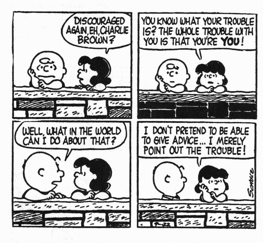 Our approach to Peanuts, then, will not be one of “reading into” but of “reading out of”; our concern will not be so much in trying to say what Mr. Schulz has actually put into his cartoons, as in saying what has come out of his cartoons to us. Confession, or witness, is the basis of a Christian interpretation of art as it is the basis of a Christian interpretation of anything. It just may be, however, if an interpretation should seem to account coherently for all or most of the puzzle’s pieces, that the interpreter’s intuition has coincided with the artist’s vision. But still there is no way of knowing for sure.