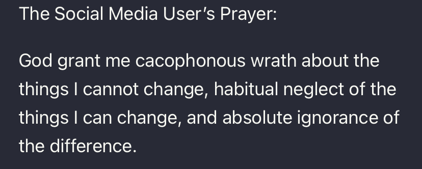 Most Consistently Devastating Instagram That’s Also Very Funny: Meditations for the Anxious Mind (favorites being Therapy Culture, Why Everyone’s Running Now, Left Wing Academics, and LinkedIn Warriors)